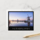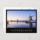 Postcard of a purple sunrise over the windmills of Kinderdijk in the Netherlands in winter with some snow and ice on the water with a black border and the text: 'Netherlands'.