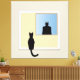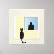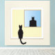A black cat sits at a window and sees a silhouette of a superhero in the opposite window.
