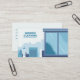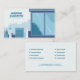 A business card for professional window cleaning services. It illustrated with a window with clean and dirty parts and a background with a city skyline including buildings. On the back there are a list of services with full contact!