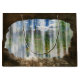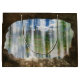 Looking out of a cave under a waterfall onto an idyllic scene in a small river valley. Through a gap in the falling water a cottage is visible just beyond the curve of the river. The water streaming past the opening breaks the sunlight into many colors and sparkles.