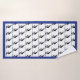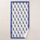 Windsurfer on board and blue, white stripes windsurfing bath towel set. It displays a minimalist pictogram icon of a black silhouette windsurfer on white background with a blue border. The washcloth is of solid blue color while the hand towel includes a two tone blue striped pattern.