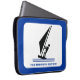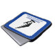 Windsurfer on board black, blue windsurfing laptop sleeve that displays a minimalist pictogram icon of a black silhouette windsurfer and your text on white background with blue border. Personalize it and change text with monogram, name or your message.