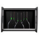 A silhouette of three black wine bottles with green labels that are glowing in the dark.