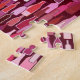 Wine bottles in a range of plum, rose, eggplant and mauve with cream against a burgundy wine background
