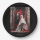 A Gothic Wedding couple dressed in wedding attire standing under a Roman archway. The background is dramatically painted in shades of red, evoking a sense of blood splatter, which adds a dark and eerie atmosphere to the scene. The groom is wearing a black suit with a red boutonniere, and his hair is styled in a sleek, gothic manner. The bride is in a white dress adorned with intricate patterns, her long dark hair complementing the gothic theme. Both characters have pale complexions and an ethereal presence, further emphasizing the gothic esthetic. The overall mood is a blend of romance and macaber, characteristic of gothic art.