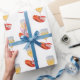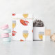 Wrapping paper decorated with a colorful illustration of a lobster claw around the stem of a white wine glass. Artwork: Color pencil. Copyright Dominic A. White.
