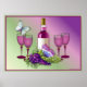 Jewel toned bottle of wine with two elegant wine glasses. Green and purple grape clusters attractively displayed in the foreground.