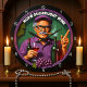 This charming round artwork features a portrait of a smiling man with a white beard, cap, and glasses, enjoying a cigar and holding a glass of red wine. Two wine bottles and a bunch of grapes sit on the table before him. The humorous phrase, 'HOPE YOU BROUGHT WINE,' is displayed prominently around the edge, set against a rustic green wood background.