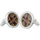 These decorative cuff links feature an abstract pattern of an upright red and black bottle of burgundy wine bottle next to more bottles in a brown, gold and yellow wooden wine rack. A rustic orange brick wall background completes the composition.