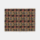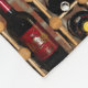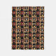 This contemporary fleece blanket features a repeating abstract pattern of an upright red and black bottle of burgundy wine next to three more bottles in a brown, gold and yellow wooden wine rack. A rustic orange brick wall background completes the composition.