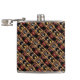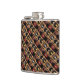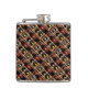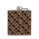 This elegant, decorative hip flask features a repeating abstract pattern of an upright red and black bottle of burgundy wine next to three more bottles in a brown, gold and yellow wooden wine rack. A rustic orange brick wall background completes the composition.