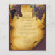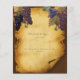 Vineyard Wedding menu. Old paper background with curled and torn edges on a deep burgundy background. Pretty purple, and blue grape vine accents.