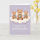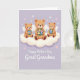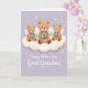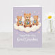 Designed with three plush-like bear figures with small, airy wings, the front shows them seated close together on a big, fluffy white cloud, leaning in as if sharing a gentle moment of family affection ❤️. The middle bear is slightly larger and sits forward, while the two smaller bears curve in on either side to form a soft arc. Each bear cradles a bouquet of wildflowers in soft blue, sunny yellow, and tender pink, with their paws tucked in and their faces turned toward one another like close friends. Behind them, a calm lavender background sets a soothing scene, dotted with tiny heart shapes that float lightly around the group. Beneath the cloud, the message “Happy Mother’s Day Great Grandma” appears centered in white lettering, standing out clearly against the purple backdrop. The overall colors stay light and pastel, with gentle shading that gives the cloud a pillowy look and the bears a cozy, caring presence 🌼. Small heart motifs are scattered across the lavender background, with a few placed near the bears’ wings and above the top of the cloud.