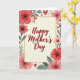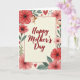 This card features a cream-toned center panel edged with a thin red border, with the words “Happy Mother’s Day” centered in crimson lettering. Around it, a garden-like frame of red and pink flowers leans inward as if gently surrounding the message, creating a cozy, affectionate scene ❤️. Dark flower centers add contrast, while soft green leaves and small blue accents tuck between petals for a calm, airy look. In the top-left corner, a small winged infant with rosy cheeks and golden wings reaches forward, offering a tiny pink token that reads like a sweet gesture of care. Small ruby-red hearts are sprinkled around the border, like little notes of fondness floating among the blooms 🌼. The lighting feels softly diffused, giving the illustration a watercolor-like finish with smooth transitions between colors. Blue flourishes and scattered heart shapes sit between the larger blossoms along the outer edge.