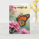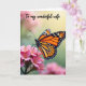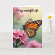 This greeting card features a close-up of a large winged insect resting on a cluster of pink blossoms, its orange, black, and white wings spread open like a gentle embrace ❤️. Soft light catches the fine antennae and the delicate veining in the wings, while the flowers lean toward it as if sharing a quiet moment. The insect sits slightly to the right, held in crisp focus, and the background melts into a smooth blur of muted greens, warm yellows, and faint pinks. The contrast between the sharp, geometric markings on the wings and the velvety petals creates a tender, intimate look, like two companions drawn together by calm attention. Near the top, the message “To my wonderful wife” appears in a flowing dark font that stands out clearly against the lighter background. The blossoms show tiny golden centers that glow softly, adding a small touch of warmth 🌼. Behind everything, the out-of-focus garden colors form a gentle, painterly haze with rounded light spots.