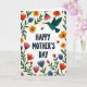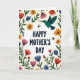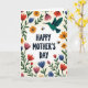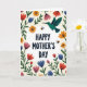 Designed with a soft, creamy background, this card features a white rectangle centered like a note, surrounded by a garden-like frame of stylized flowers and leaves. The main message sits in the middle of that white panel in dark lettering, easy to spot at a glance, with the words arranged in a neat, centered layout. Around it, clusters of blooms in red, blue, orange, and pink lean inward as if they’re gathering close, giving the scene a cozy, affectionate feel ❤️. Green stems and leaves weave between the petals with simple dark line details that suggest texture without getting fussy. Near the top right of the central panel, an emerald winged creature hovers mid-flight, its outstretched wings adding a light, flirty energy to the composition 🌼. Tiny dark insect shapes are sprinkled among the foliage, like small companions tucked into the corners of the floral border. The flowers show rounded petals with dark inner marks for centers and stamens, and the winged creature’s feathers are outlined with fine lines near the upper-right edge of the white panel.