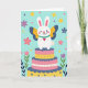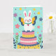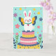 This design shows a white bunny-like character with butterfly wings in bright mixed colors, sitting proudly on top of a three-tier cake 🐰. Its rosy cheeks, small pink heart on the chest, and light green collar give it a tender, friendly look, as if it’s posing for someone it cares about. The cake layers alternate sunny yellow, soft pink, and deep blue, each trimmed with scalloped frosting and dotted patterns that feel festive without being busy. A white band with tiny red dots wraps around the middle tier, adding a neat little detail that draws your eye to the center. Behind everything, the background is a smooth aqua field sprinkled with simple flower shapes in pale purple, yellow, and pink, along with a few floating colored circles. Along the bottom, tulip-like blooms and green stems rise up around the cake, with darker leaves tucked in for contrast 🌷. The greeting text sits near the top in a light color that stands out against the aqua, while a smaller line of text rests closer to the bottom edge in a matching tone. The wings show multiple colors arranged like small panels, with the tips curving outward above the bunny’s ears.