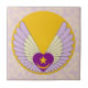This tile features a purple Sufi heart with gold star and crescent surronded by yellow and lavendar wings atop a brilliant gold sun on a background of yellow and lavender clouds. Use as the basis of a trivet or gift box.