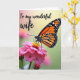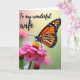 This design shows a close-up of a winged insect with orange-and-black patterned wings, dotted with small white accents, resting gently on a rich pink flower. Its thin legs touch the sunny yellow center, and the insect’s curved antennae angle forward as if leaning in with quiet attention, like a tender pause shared between close companions ❤️. Soft natural light washes over the petals, giving them a smooth sheen and bringing out fine textures along the wing edges. In the upper left, the message “To my wonderful wife,” appears in a flowing style, set in a dark tone that stands out against the soft background. Behind the main subjects, the scene fades into a blurred mix of soft greens, muted yellows, and a hint of blush, keeping the focus on the flower and wings. The strong contrast between fuchsia petals and warm orange markings creates a romantic, intimate focal point, like a gentle gaze held for an extra moment 🌼. The background remains painterly and out of focus, with the pink bloom and bright yellow anthers sharp in the foreground.