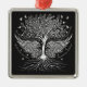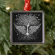 Metallic silver set of wings, tree and roots symbolizing wings to fly with details of birds, hearts and flowers on a black background. Artwork features wording, “Give the ones you love wings to fly, roots to come back and reasons to stay. She flies on her own wings. Rooted in love, she blooms.” Christmas Tree Ornament