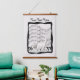 This tapestry with wood hangers has a black and white image of a white fluffy cat walking on the top of piano keys with bars of wavy music notes framed in a black with white dotted frame. Customise your text with the template.