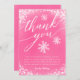 Cute winter wonderland theme baby shower thank you card featuring white glowing snow and snowflakes with a typography script text that says "thank you." The editable message thanks guests for coming to the shower and for the gift. The background is pink. Great for a girl's Christmas season shower.