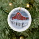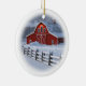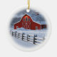 Christmas tree ornament featuring a beautiful red barn in a wintery ranch scene.
