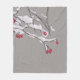 Beautiful and stylish winter fleece blanket with a digital illustration of branches with red berries covered in fluffy snow over light grey background.