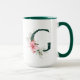 This mug features a forest green monogram adorned with winter foliage and a red poinsettia.