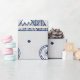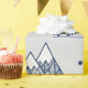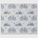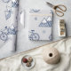The minimalist design features a delicately detailed bike and mountain range pattern in navy blue on a cozy gray background. Snowflakes falling from the sky and geometrically designed mountains blend harmoniously to capture the romance of winter travel.