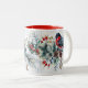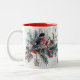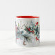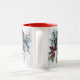 Birds on pine branches with berries and pine cones on a light wood background. Glazed inside in red. Give this fun gift to a friend, or add to your holiday collection. Strong, ceramic construction, microwave and dishwasher safe.