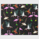 A funny pattern that kids and bird lovers will enjoy. A pattern of birds wearing winter clothes. The background is a starry sky. There is a pink flamingo wearing gumboots comma a stalk wearing a scarf, a puffin wearing a winter hat and a duck wearing boots.