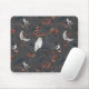 Winter birds on branches with white snowy owl and crescent moon pattern on gray background.