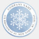 Personalized round Christmas company return address labels feature decorative white snowflake and border on watercolor light blue background, modern and trendy.