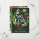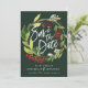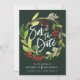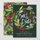 Winter botanical foliage red and green watercolor wedding save the date card. Green backer design.