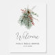 Celebrate in style with this minimalist rustic winter foliage welcome sign featuring a watercolor floral arrangement of pine leaves, red berries and eucalyptus greenery. With elegant handwriting calligraphy.