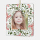 A modern and elegant holiday ornament that frames your favorite square photo in a beautifully detailed frame with tiny red watercolor berries and green winter foliage on a white background. Personalize the back of this unique Christmas photo ornament with your family name and the year.