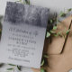 Elegant memorial service invitation, featuring a photo of a bridge at winter with snow-covered trees. The back has a marble background.