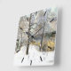 Artist by Zolotareva. watercolor on silk - manual drawing; the stone bridge through the river in the village.A view of a snow-covered bridge in the woods. Frozen Snow Winter Forest Scene.There is snow, spectacular scenery.