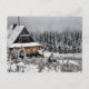 Crisp Winter scene, featuring a snow covered wooden cabin. Evokes Christmas in the wild, rugged landscape.