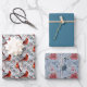 Set of three sheets of Christmas Wrapping paper in coordinating colors. The first sheet has cardinals sitting on branches of berries with a blue background. The second sheet is a solid marine blue to match. Lastly, the third sheet has watercolor flowers, leaves and berries with a festive holiday vibe.