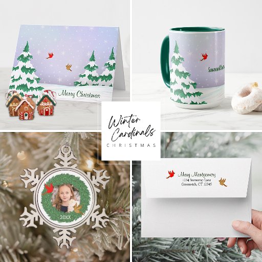 Enjoy your coffee or hot chocolate each Christmas and winter season with my cute pair of cardinal birds flying to greet each other between snow covered evergreen trees against a blue and lavender winter sky filled with falling snowflakes. Personalize it with the provided name template between the cardinal pair, customize it further by having one of the cardinals land on your name :) Season's Greetings!