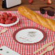 Minimalist winter bridal shower paper plates featuring a watercolor illustration of a Christmas ornament with wedding rings, pine twig and Christmas berries. With elegant handwriting calligraphy.