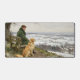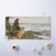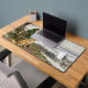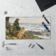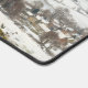 This deskmat features a digital image of a man and his dog sitting and gazing peacefully over a winter landscape, created by digital artist Jayne Wilson