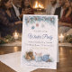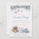 Winter gathering design featuring soft blue and ivory tones, pine garland with ornaments, and light snow texture. Detailed accents include lace-up boots, knit hat, and hot cocoa mug with candy canes. Script headline with clean layout suited for hosting a seasonal home party.