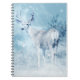 A spiral notebook with an image of a majestic deer in wintertime. An icy blue filtered background gives this photo a cold winter look with a magical feel. A noble deer stands on a hill with wintery pine trees in the background.