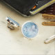 A lapel pin with an image of a majestic deer in wintertime. An icy blue filtered background gives this photo a cold winter look with a magical feel. This proud, noble animal stands on a hill with wintery pine trees off in the distance.