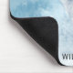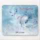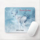 A personalized mouse pad which says Seasons Greetings, which can also be customized to read something else. Designed with an image of a majestic deer in wintertime. An icy blue filtered background gives this photo a cold winter look with a magical feel. A noble deer stands on a hill with wintery pine trees in the background.