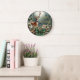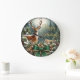 This enchanting clock features a beautiful brown deer standing in a snowy winter forest under the glow of a full moon, surrounded by pine boughs and berries. The text "Happy Holidays" is scripted in sparkling gold glitter, while the bottom is anchored by a large, ornate green bow and pinecones. The design may look real due to the high detail and three-dimensional texture in the artwork.