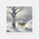 A peaceful winter scene showcases two deer standing close together in a snow-covered forest by a birch tree with a heart-shaped carving and softly falling snowflakes.